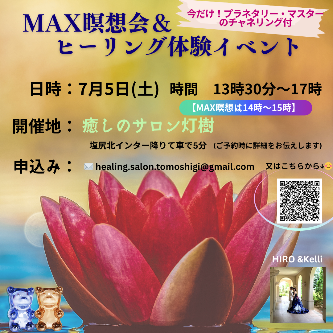 今回初めてのサロンでイベントになります。ゆっくりのんびりとした時間をお過ごしください。瞑想会の後にお昼寝タイム、チャネリングモニターセッション、さらにヒーリング体験もできます。暑い夏がもうはじまりました。暑さの重さでやる気がでないからだが重い方にオススメ!瞑想&DNAアクティベーション!!心身がスッキリしてなんだか気になっていたことをちゃちゃっとやりたくなります。私は先延ばしにしていた本の断捨離をしました。🌟 日時 7/5(土)13:30~17時🌟 場所 癒しのサロン 灯樹 (詳細はDMにて)7/5初サロンでのイベントに来て下さった方ありがとうございました。30℃を超える暑さの中本当にありがとうございます。瞑想、使命タロット、プラネタリーマスターのチャネリングモニターセッションをさせていただきました。瞑想では「スッキリしました」「いつもより鮮明な映像がみえました」「よかったです」と感想をい...