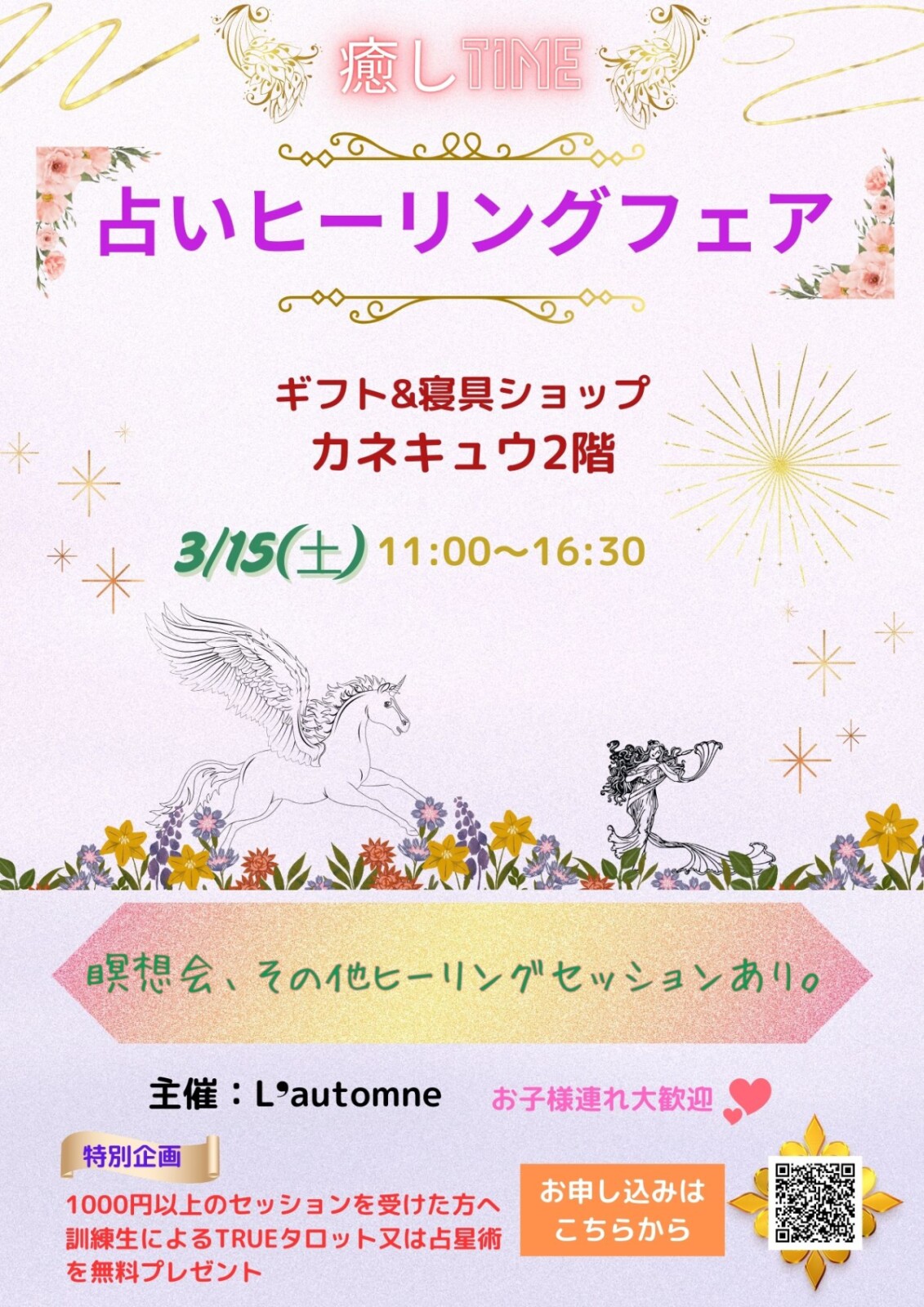 場所:ギフト&寝具ショップ カネキュウ(長野県松本市) 時間:11時~17時 11時~13時 ヒーリング&占い 13時~14時 MAXめい想システム™ 14時~17時 ヒーリング&占い 内容:🌟DNAアクティベーション 20分3,500円 30分 5,000円 (通常60分15,000円 スパジェリック付き) 🌟ラータロット 20分3,000円 30分 5,000円 (通常60分10,000円) 🌟MAXめい想 ...