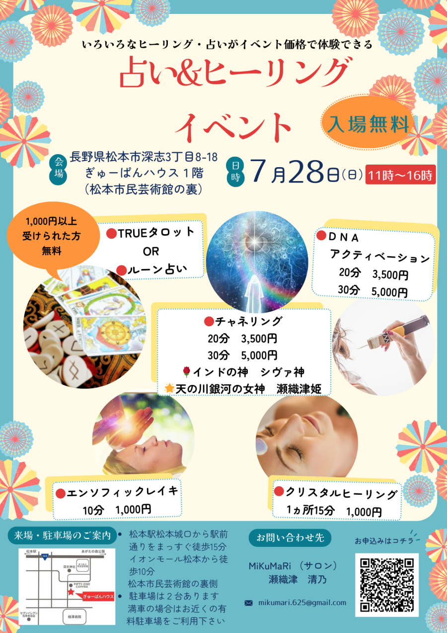 8/11(日) に松本で癒しと安らぎの時間 ヒーリング&占いイベント をします。